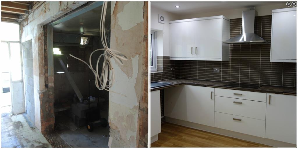 Work started by stripping the entire house, the kitchen and dining room was also reconfigured by moving the door which originally opened into the kitchen to open into the dining room instead. This created more space which also meant the dining room had patio doors that opened onto the large garden.